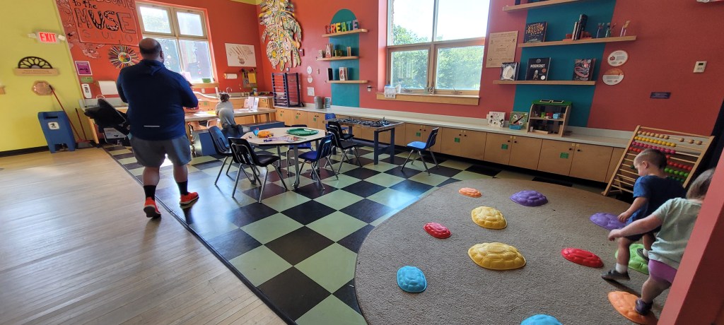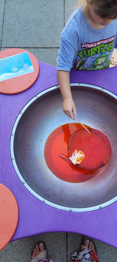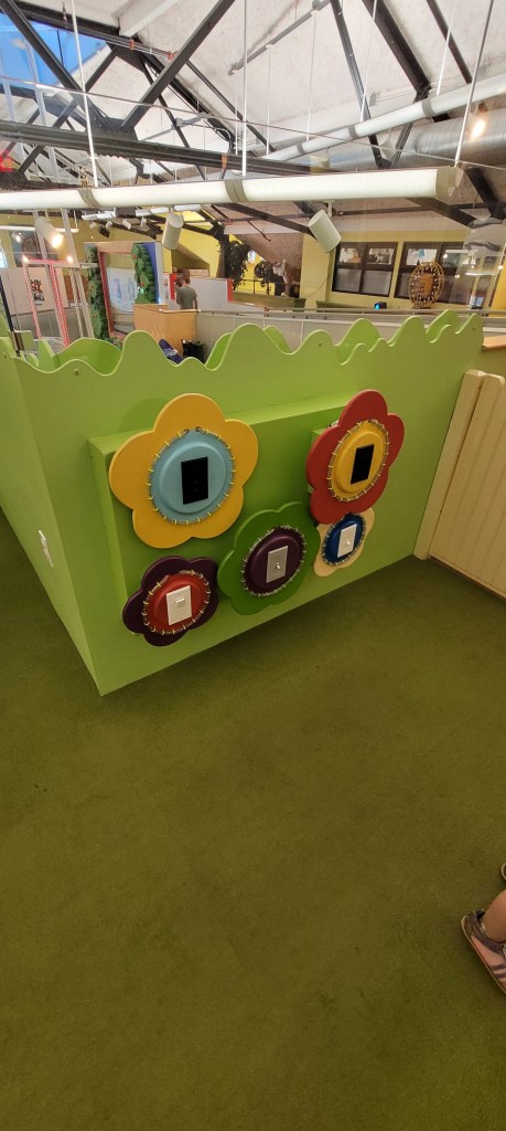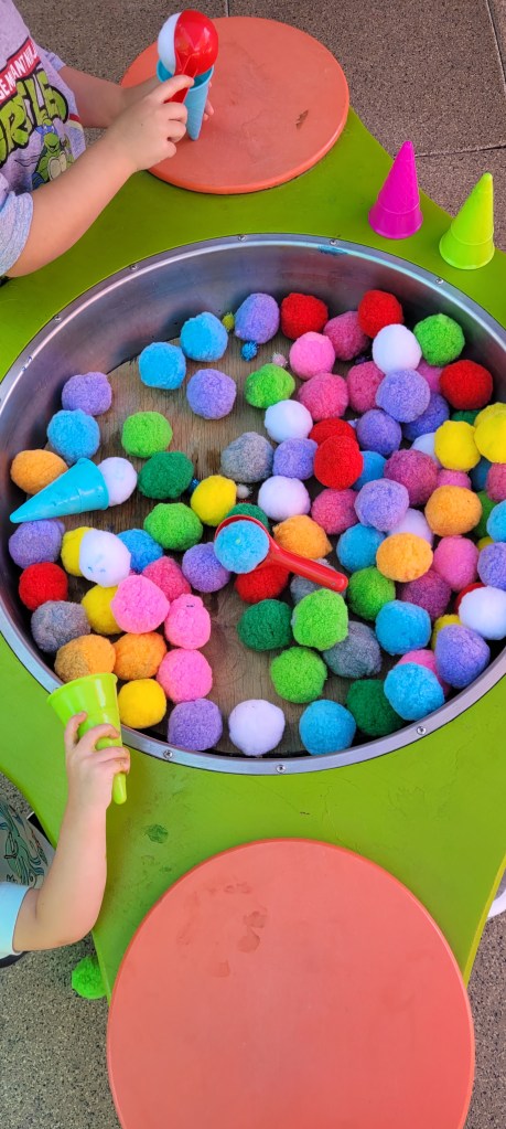 Im gunna travel back here to the sensory patio I mentioned. I wasn’t able to see this the first time we came as it was pouring outside. Anyway, I was immediately impressed. A giant paint board is to the immediate right. There’s no spill cups filled with paints and some paint brushes. The board is self is a sheet of plastic so you can paint over and over again. There’s different stations and different activities on the tables. At our visit there was a giant ice cube with dinos inside for kids to rescue using a sucker bulb thing to then squirt warmer water onto the ice. Other tables included a bug sorting game, an ice cream shop using cotton balls and pom poms. I’m sure this changes as does everything inside.