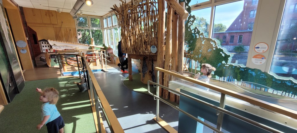 Around the bend are grocery stores and kitchens. They showcase foods from all of the world. Each section here represents a different country and culture. Again, small details. They’re really great. Across from the stores is a boating and river section. In the boat there are soft brick to build with. There’s a sail thar you have to crank a wheel for it to go up and down. Kids can sport a yellow boat jacket and hat, should they want to captain the ship. The river section allows kids to dress as a beaver and make their own dams. A small tree house with some stuffed birds and fish is nearby with stairs to climb up. This is another favorite exhibit of my 4yo.