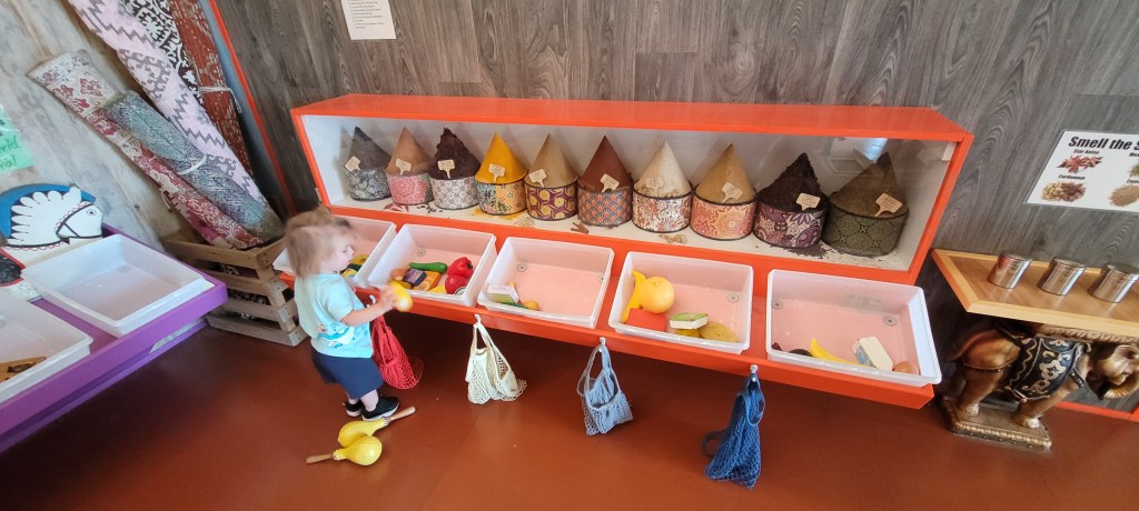 Outside that area is a small pretend train car. It has two benches for parents to tide along as their kid steers the train. Beside this is a weaving station where kids can practice their fine motor skills. I’ve never seen many kids at it and my kids have had no interest.