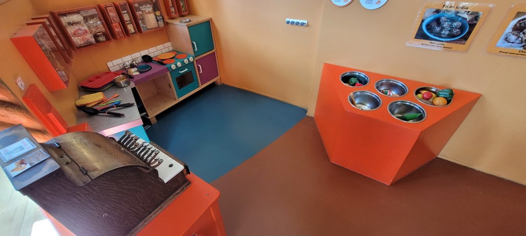 Okay let’s get back to the actual museum. It’s $12.50 for children 12m and up and adults. There are two time blocks to choose from and you must reserve your time before arriving. Check-in is a breeze and fast the times we’ve been. The don’t allow strollers so where you put your coats you can also store your stroller here. A small detail I love about this storage area is the wall hooks. Yes. The wall Hooks. There not regular hooks, they use every day things as hooks. For example, rain boots, bathroom sink knows, utensils and much much more and my daughter likes picking one out.