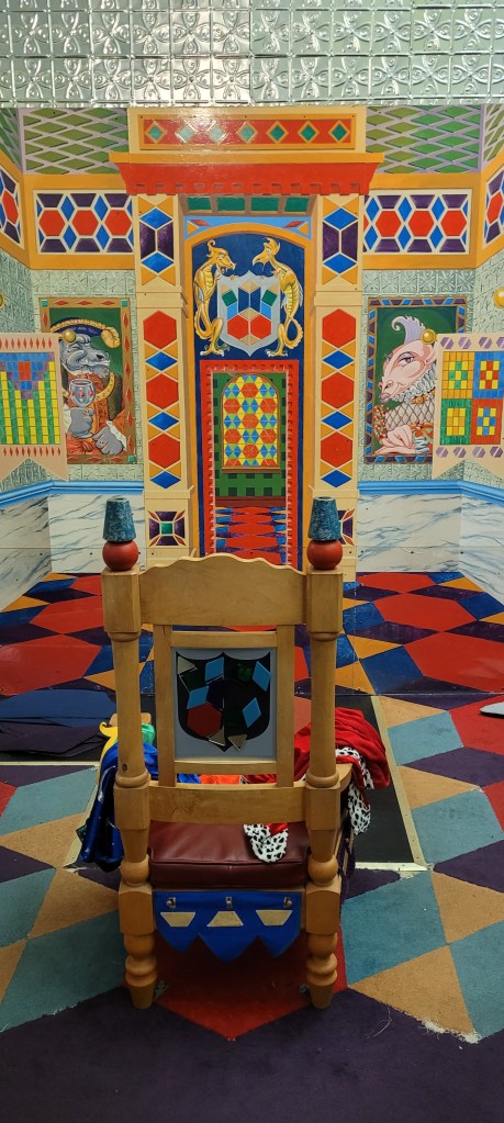 The last exhibit inside is the king/queens castle. The windows are see through but kids can use the shapes cut out to stick on the window to tile their castle. This can use up a lot of time if you’re looking to do that. There’s a thrown in the middle with a robe and crown so you can really play the part. A fireplace that needs to be repaired is on here. To repair you match velcroed shaped bricks to the shape in the wall. A similar activity is on the floor, where you match rug cut outs to the shape. A puppet show prop is near the thrown in case your highness needs some entertainment.