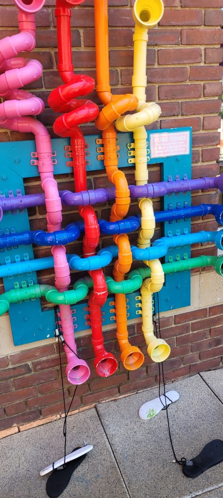 Theres a music section where kids can bang on different unconventional drums, like pvc pipes. This is covered by a tent and has one table underneath.