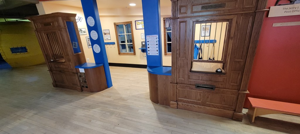 A few steps from the room is a pretend play post office. It looks like an old time post office with wooden posts on the counter windows. There mailboxes here and throughout the museum. The small details at the museum can’t be beat. In the post office hangs a list of time zones and a clock in/out spot for your little postal worker. The toddlers love the bells at each window. Space is plentiful and parents can easily fit inside (or out depending on what part you’re playing).