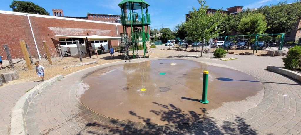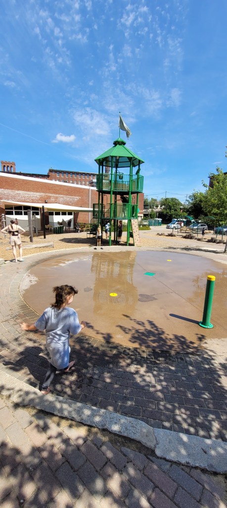 Around the parking lot is the river walk and having not walked it I can’t say how long it is but I know it circles around and it’s nice too look at. Across from the parking lot is a huge field with a few picnic tables scattered. Bring a ball and your kids can run, get sweaty, burn energy, hop in the splash pad and return to the field or playground to do it all again.