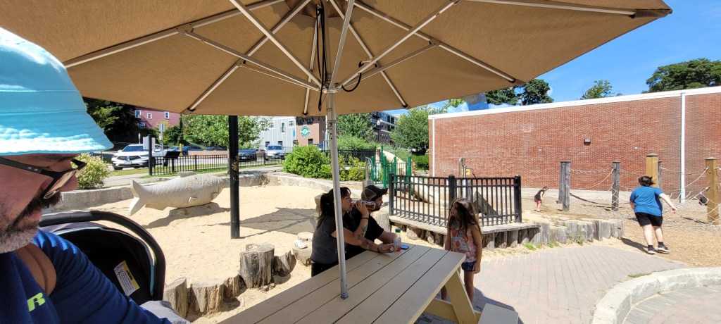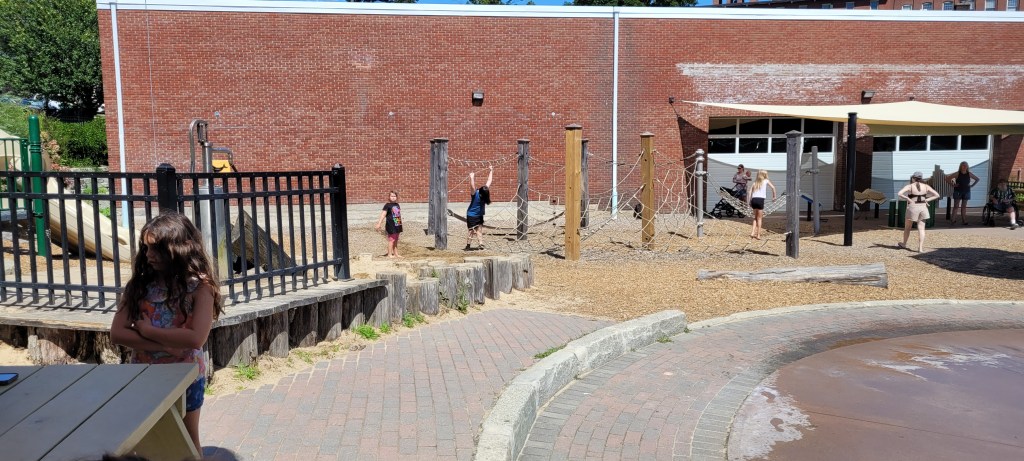 There’s a ropes course which I think is for older kids. My 4yo didn’t attempt it at all but I saw some kids on it. There’s two metal slides small enough for toddler but big enough for young kids. Be aware they can be hot in the middle of the day. There’s a giant sand box with a giant fish statue in the center. There aren’t sand toys but little one will like the sand. There’s another shaded table here. A giant walk on boat where kids can play with their imagination is here but again can be very hot midday. A swing set takes the entire length of one side, with plenty of different and regular swings.