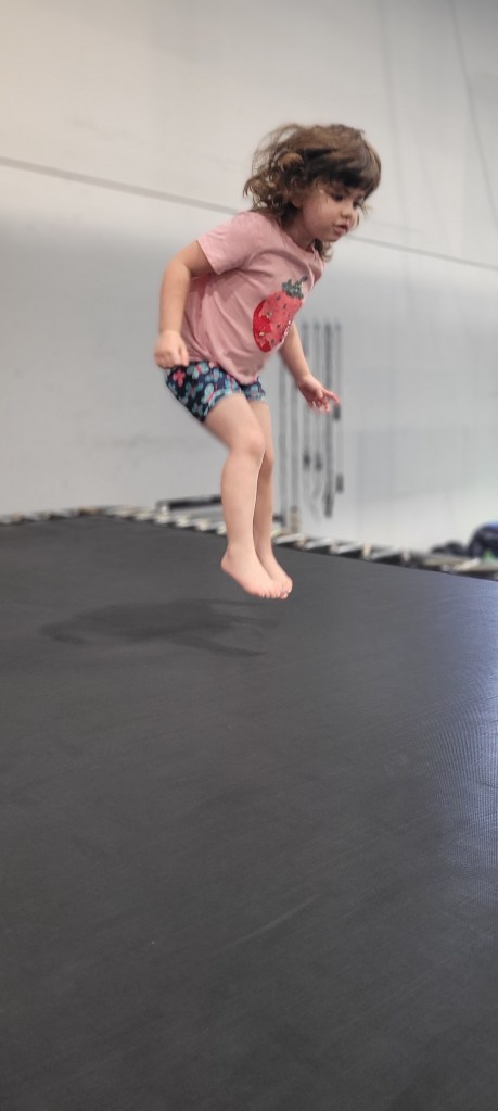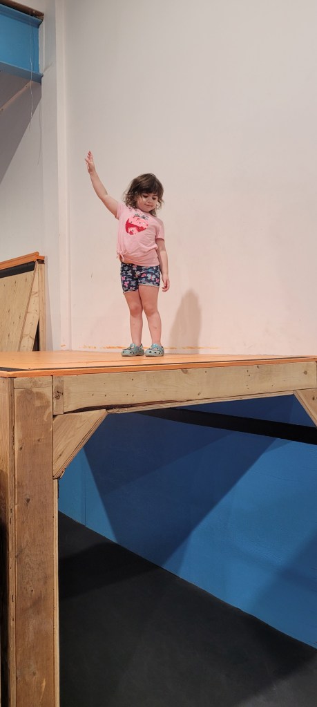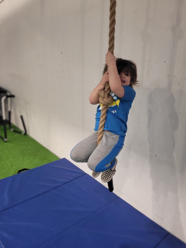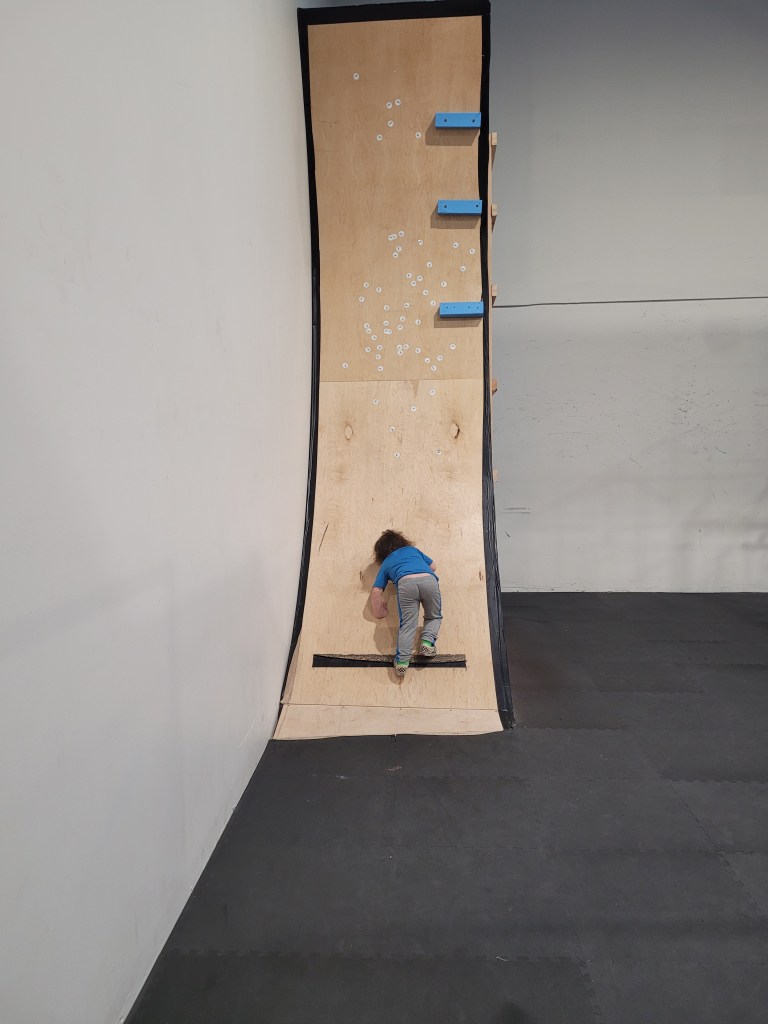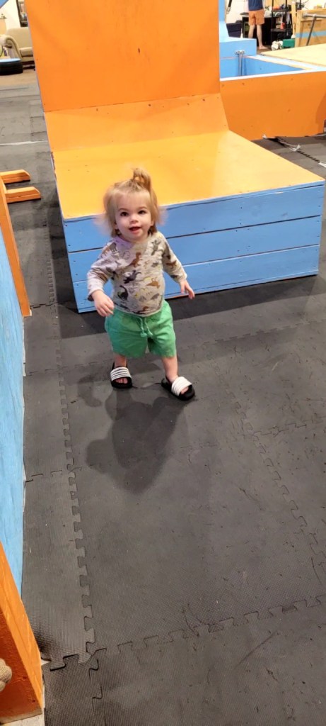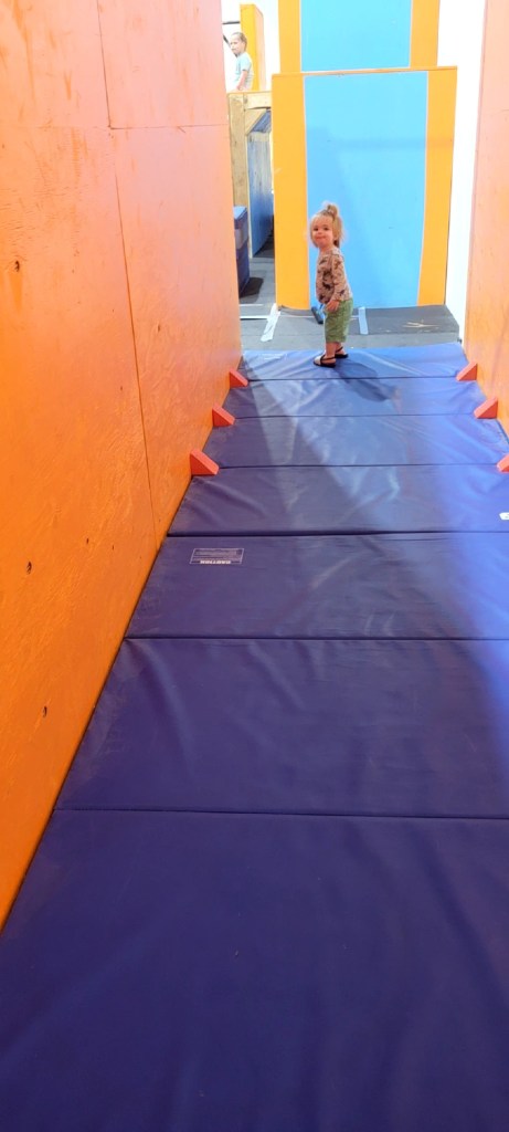 There is an array of wooden boxes to jump onto. As you can imagine small children and toddlers cannot active this. There is a wooden structure with metal poles to walk across. When my daughter was three she could do this while holding my hand. She can now do it by herself. There is some round gymnastic holds above some very padded and springy floor boards. Above your head at any given time you will likely find bars at different heights to swing from. A few ramps to run up and like on American ninja warrior they have GIANT curved wall to run up either to the top or as high as your kid can. There’s a spot for wall walking and like most of these more adventures obstacles, it’s padded below. Monkey bars and a salmon ladder can also be found in this establishment. Mostly occupied is a big rectangular trampoline. They ask only one child at a time so waiting for it can be daunting for others. There are different types of rope to attempt to climb up or like my daughter does, to just swing on.