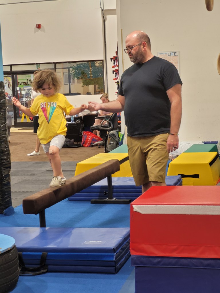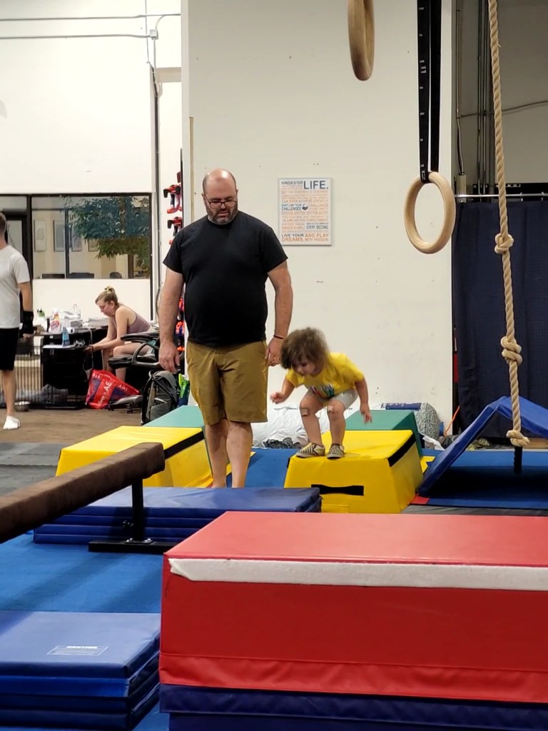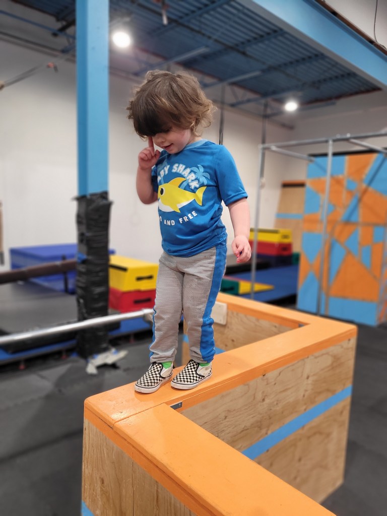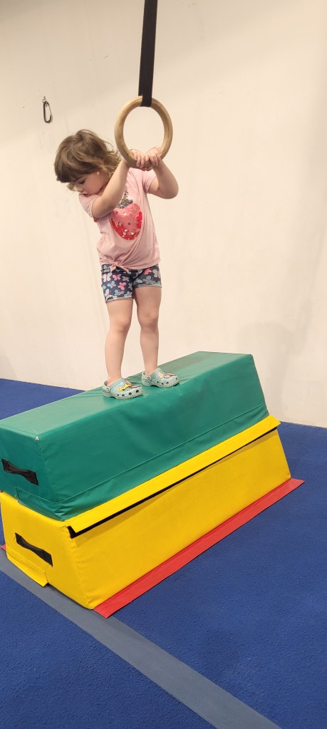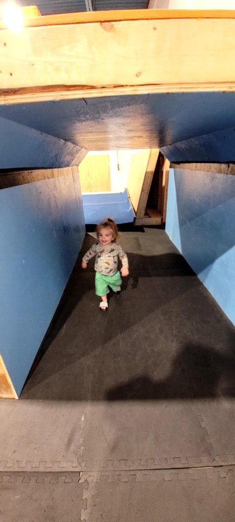 There is an array of wooden boxes to jump onto. As you can imagine small children and toddlers cannot active this. There is a wooden structure with metal poles to walk across. When my daughter was three she could do this while holding my hand. She can now do it by herself. There is some round gymnastic holds above some very padded and springy floor boards. Above your head at any given time you will likely find bars at different heights to swing from. A few ramps to run up and like on American ninja warrior they have GIANT curved wall to run up either to the top or as high as your kid can. There’s a spot for wall walking and like most of these more adventures obstacles, it’s padded below. Monkey bars and a salmon ladder can also be found in this establishment. Mostly occupied is a big rectangular trampoline. They ask only one child at a time so waiting for it can be daunting for others. There are different types of rope to attempt to climb up or like my daughter does, to just swing on.