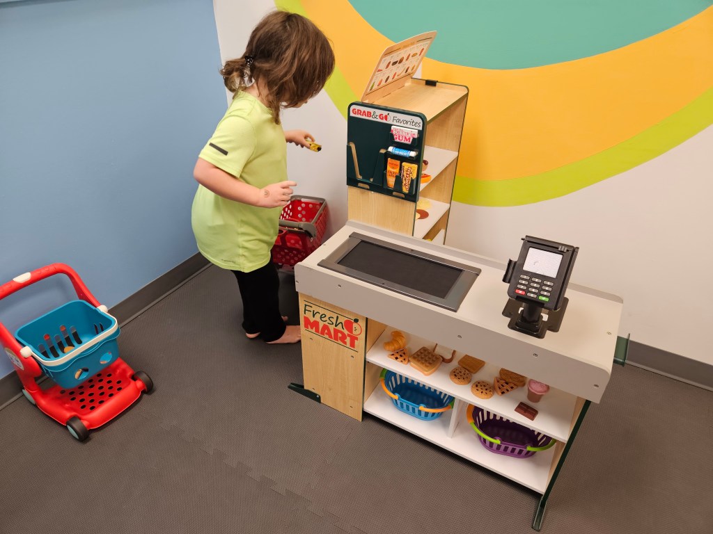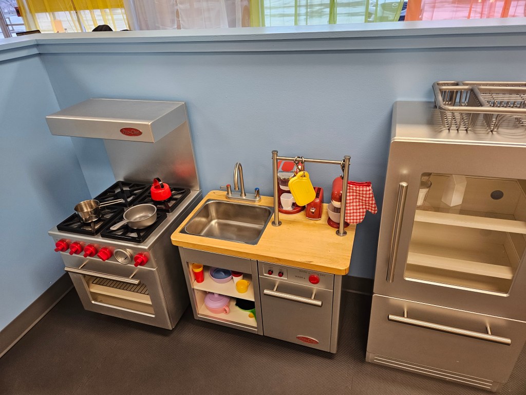 Outside of the baby area or the area immediately within the brown gate is where the walkers-preschool can find fun. Starting at the left just inside the gate, is the pretend play kitchen. This kitchen set has three separate pieces, the stove/oven, the sink/dishwasher and a fridge/freezer. In the same area is a little table and chairs for a pretend meal. Kids can pretend to shop for the pretend food at the little market stand also in the same area. My daughter, 4.5y, liked to scan the groceries then take them “home” to put the groceries away in the previously mentioned fridge/freezer. Lastly, she took the groceries out and cooked a Thanksgiving meal for everyone! There are carts for the big shoppers or baskets for the shoppers who just need a few things.