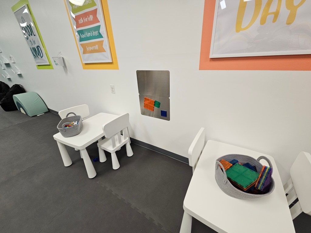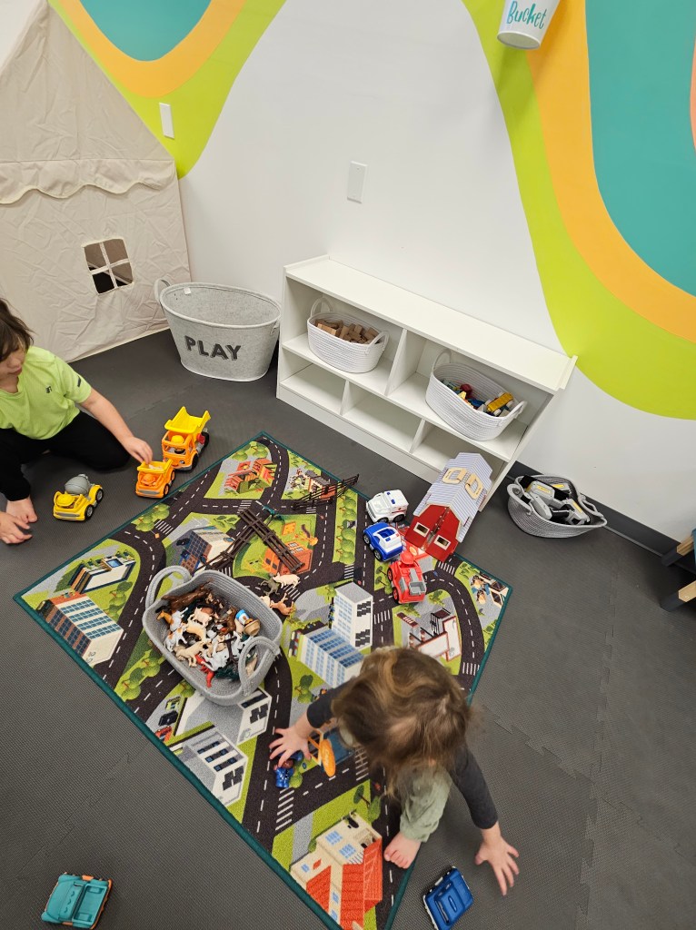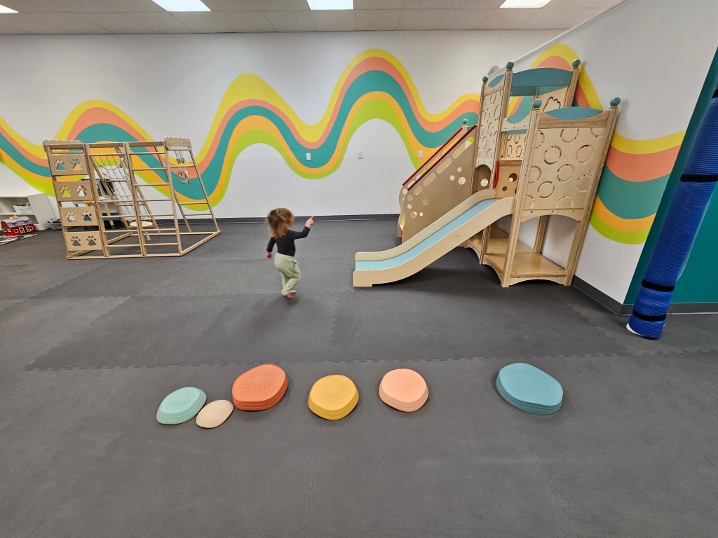 That’s pretty much it for “the big things” or the “big areas”, however there are a ton of stand alone activities and toys. There’s two small tables and chairs along the wall. On one table, is magnet blocks and there’s even a metal sheet board on the wall to build some 3-D castles, mazes, whatever your mind can imagine up. On the other table are these things, I wouldn’t even know what to call them, but they suction to whatever you stick them too. I think I’ve seen people mostly use them in bath tubs but we found plenty of ways to play with them. I think my daughter played with them for 30-40m. She built castles with the magnet blocks and used the suction things as people and they lived happily ever after in the ginormous palace she built for them. Another stand alone thing to do is a fabric play house. Although I didn’t see many kids inside, mine checked it out a few times but ultimately didn’t stay inside long. There are a ton of ride on cars, which were being used by someone at all times. You’ll find a basket full of hard plastic little people cars and trucks. There is a foam rainbow climbing set in muted colors. My ~2y separated the three pieces and walked across them, realized he could crawl and push things under the biggest one and then he turned them over and used them as a means of rocking side to side and as a hammock. There’s a set of balancing stones, again muted colors and they have different textures on them.