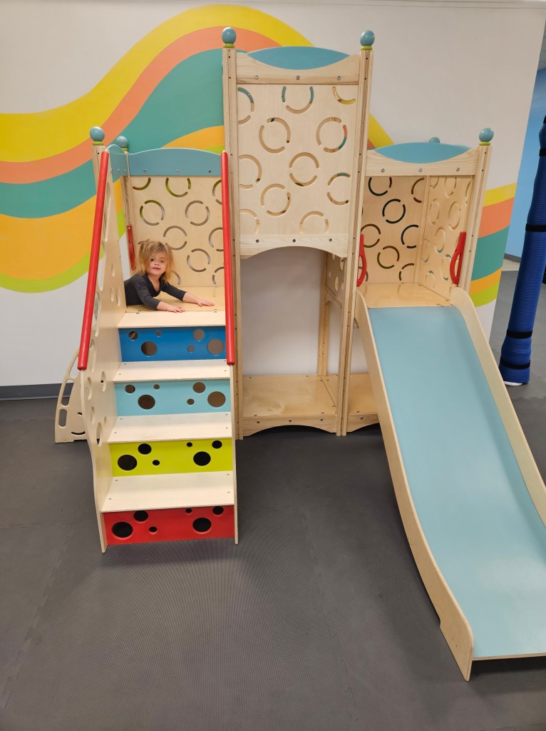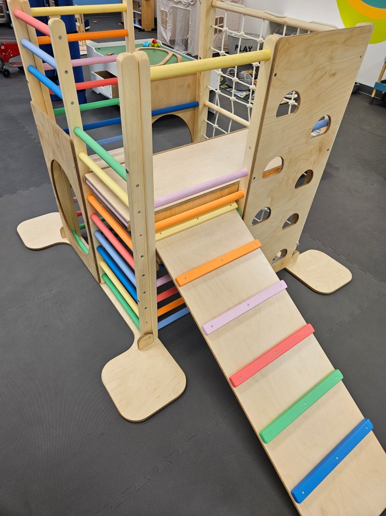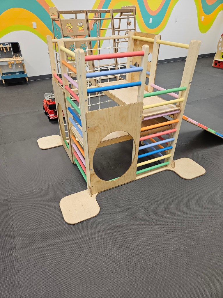 There are three different size climbing structures. All wooden and all with different ways of climbing and playing. One of the structures has colorful climbing bars on one side, a colorful climbing ramp and a net cargo net. My two walking kids, kept coming back to this one with different games and imaginative play. It was at one point a pirate ship, a restaurant and a place for hid and seek using some toys around the space. The medium size structure had some bars for climbing up, some paw print cutout holes, a cargo net, a pair of triangular gymnastic swinging bars in the center a round swing. The biggest sturcture here has stairs to climb up or a holey wall for climbing up. Keep ascending only to descending to a very slipper (but fun) slide. There’s some spots underneath to climb in and crawl through for those not ready to climb it. Again it’s the biggest structure here but it is in no way “too big”. It’s perfect for any age kid.