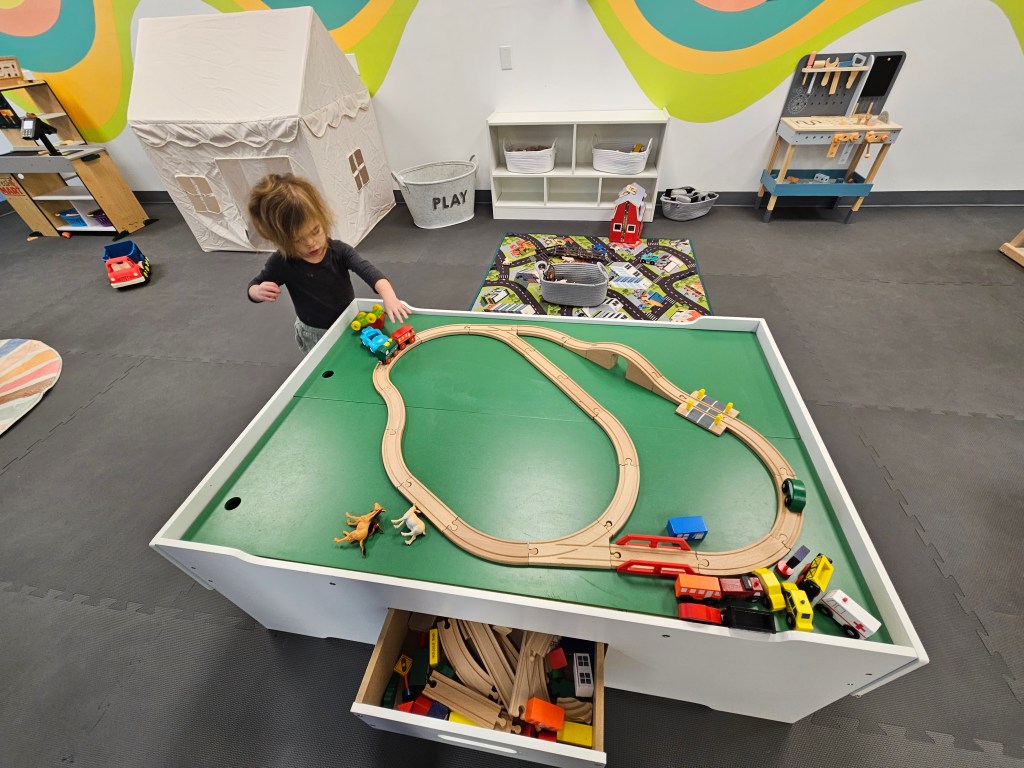 Moving along, there’s an area with blocks, Legos and a barn complete with animals and fencing. I found this area to be pretty popular just as much as the kitchen/food area. Both my almost 2y and 4.5y love pretend play so I watched them rebuild their farm over and over again. Right next to this is a giant train table. My toddler is a hug car kid so he spent the majority of his time here. There’s trains and different cars to pull along the already made track. If they want to build their own track there is a drawer full underneath the table with endless possibilities of building a really big track! In this same area is a wooden toolbench set. Along with the wooden tools, there is also some battery powered tools with real lights and sounds.